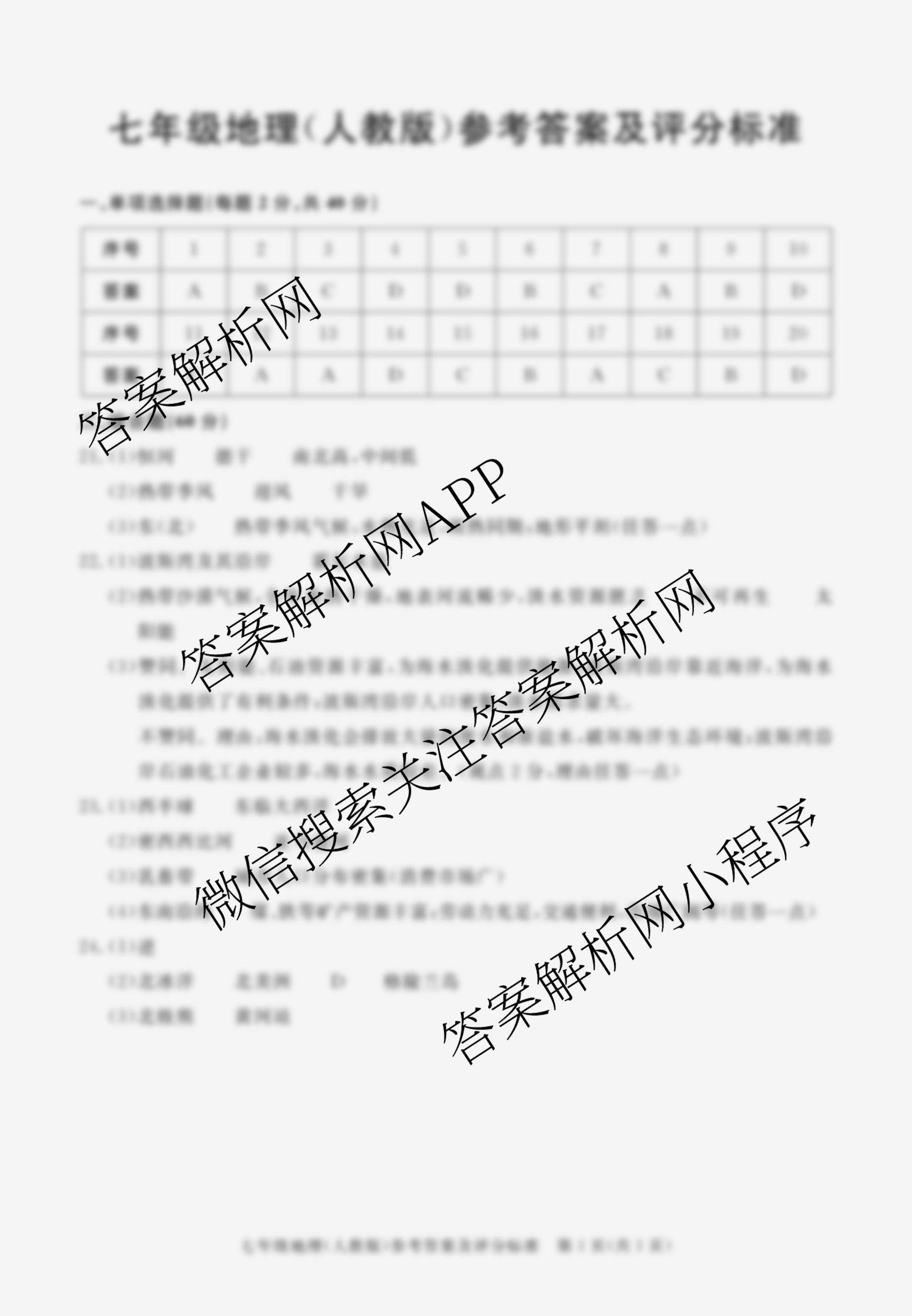 - 安徽省2023-2024学年七年级下学期期末教学质量调研地理(星球版)答案