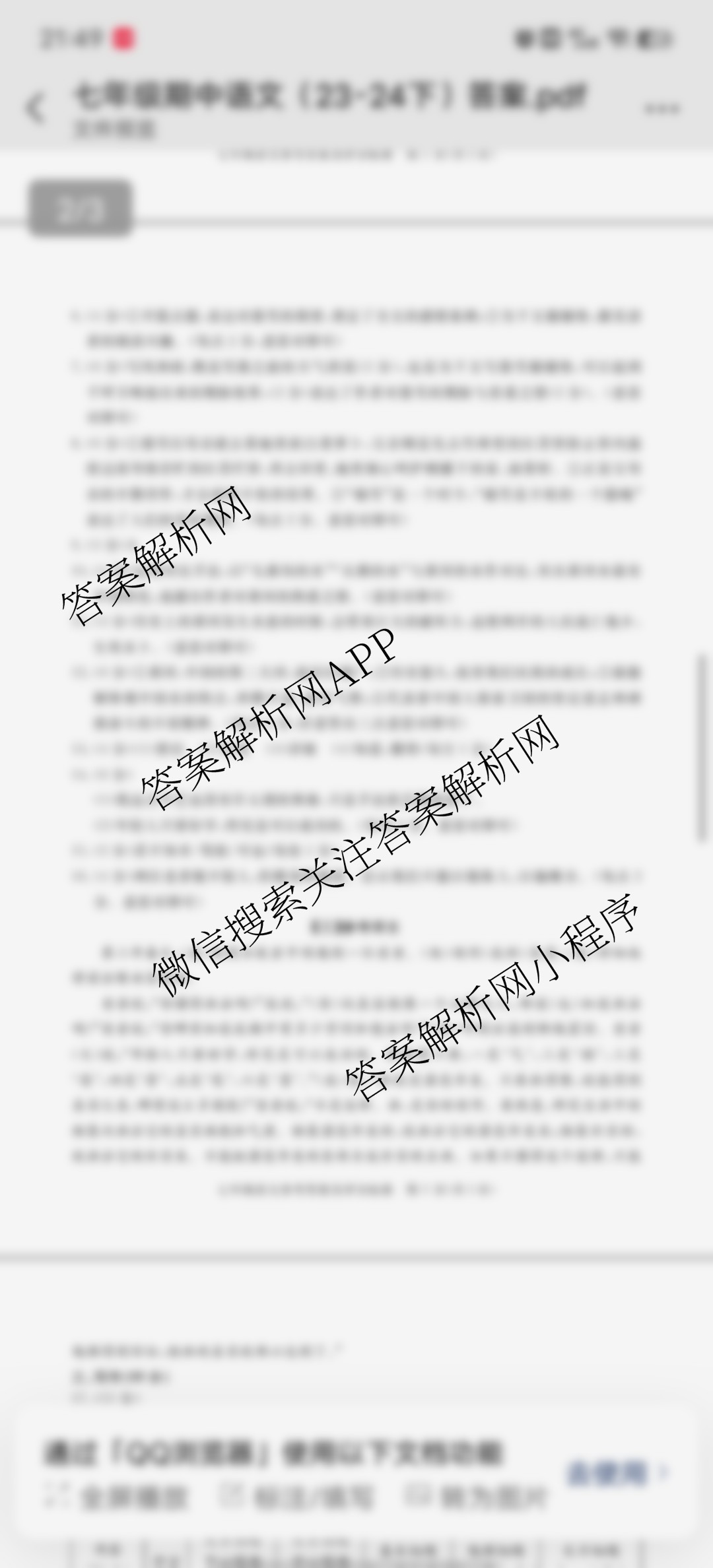 - 2023~2024安徽省学年[七年级]下学期期中教学质量调研语文答案
