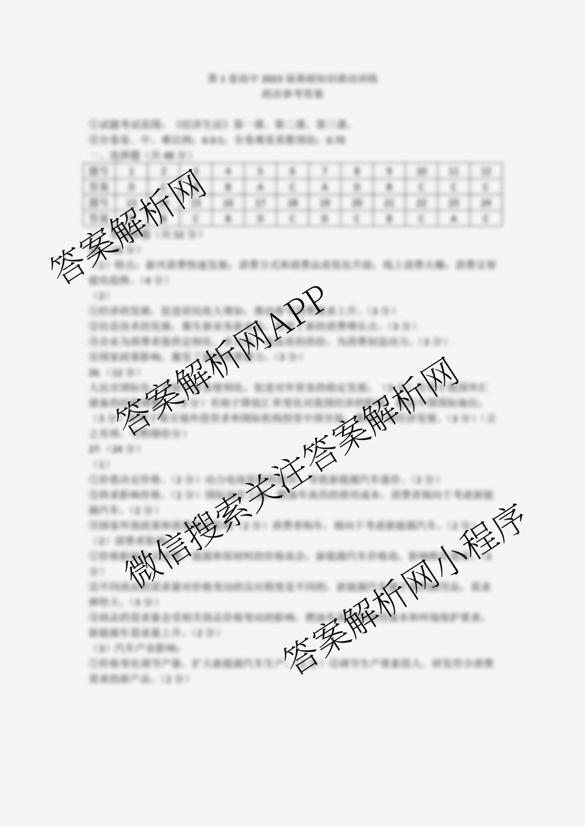 2023届(高三)国考1号1第1套 高中基础知识滚动训练(一)1政治答案