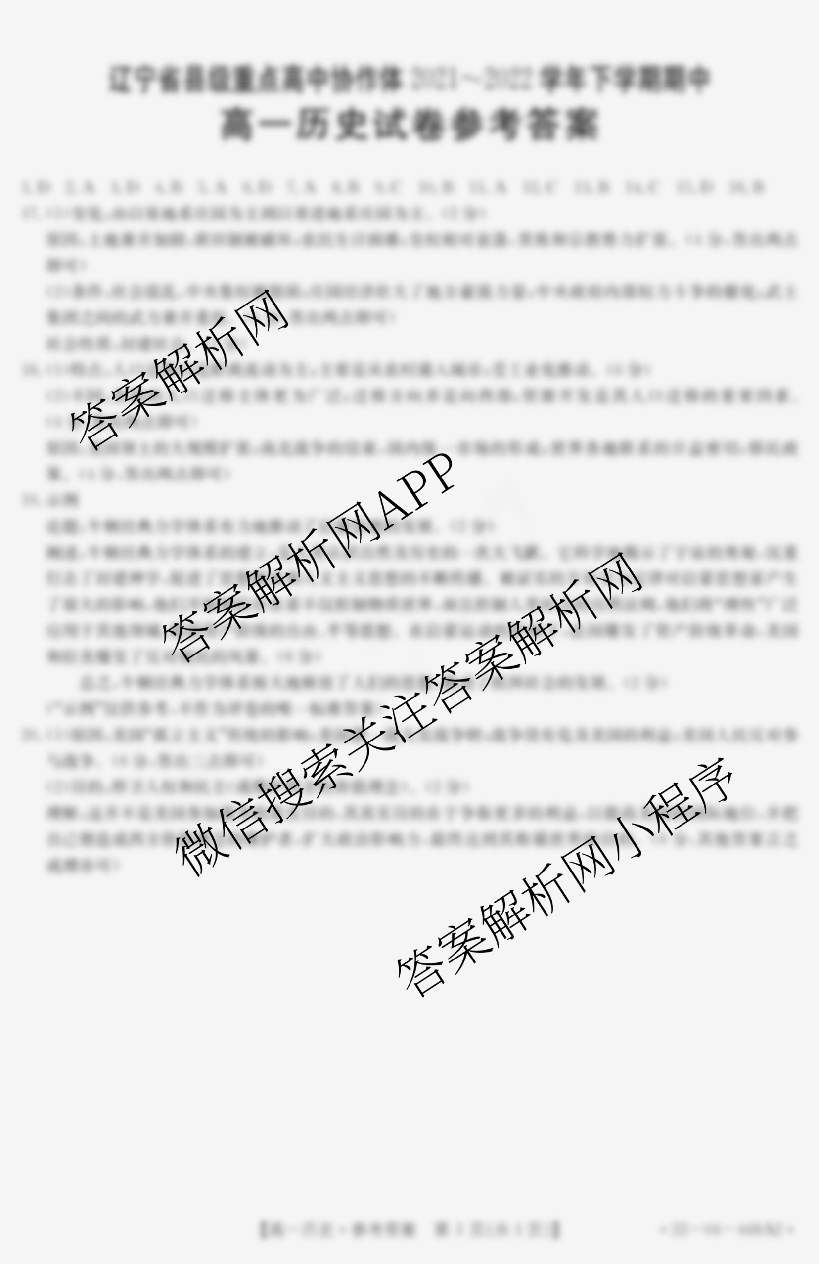 - 辽宁省县级重点高中协作体2021-2022学年下学期期中(高一)(22-04-448A1)历史答案