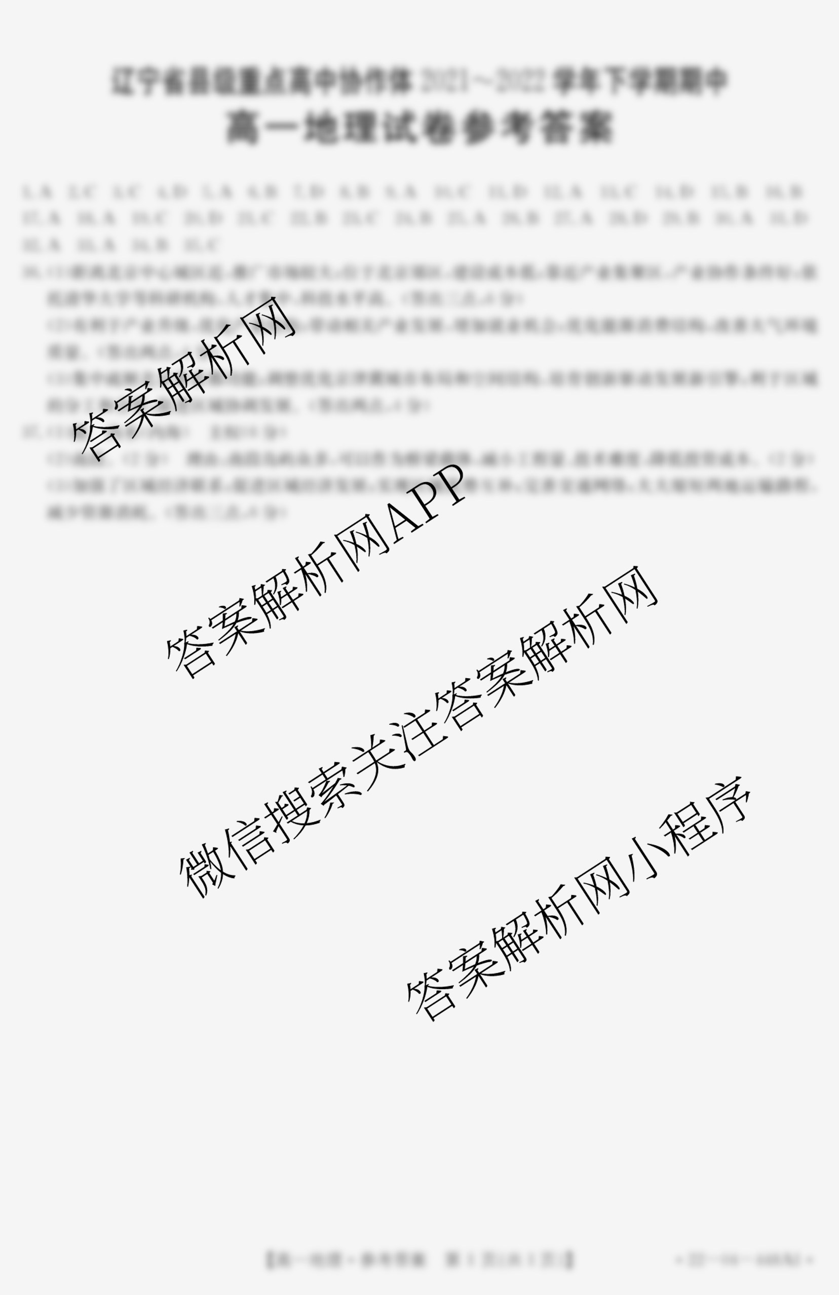 - 辽宁省县级重点高中协作体2021-2022学年下学期期中高一(22-04-448A)地理答案