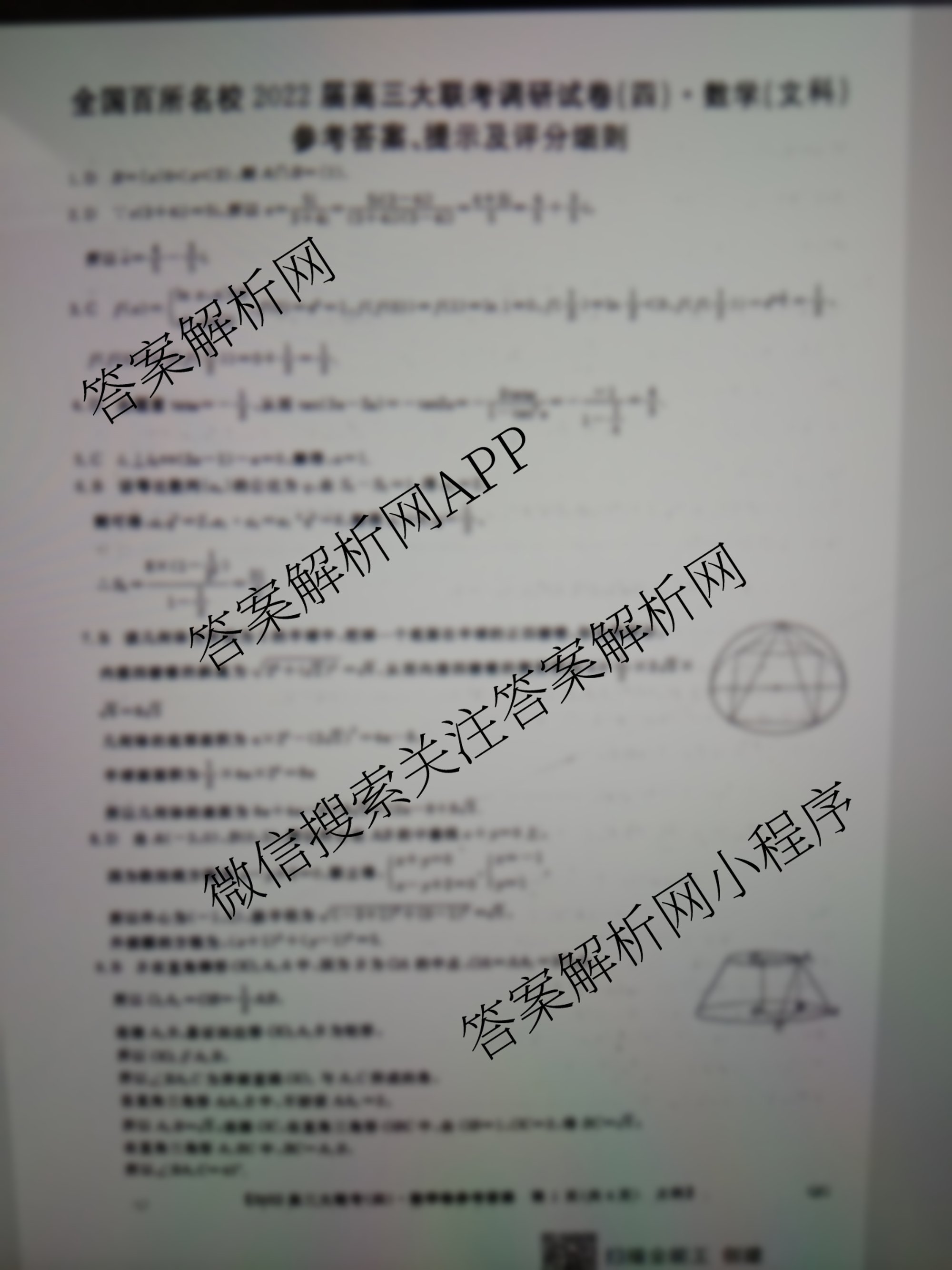 - 2022届(高三)百校大联考全国百所名校大联考调研(四)文科数学答案