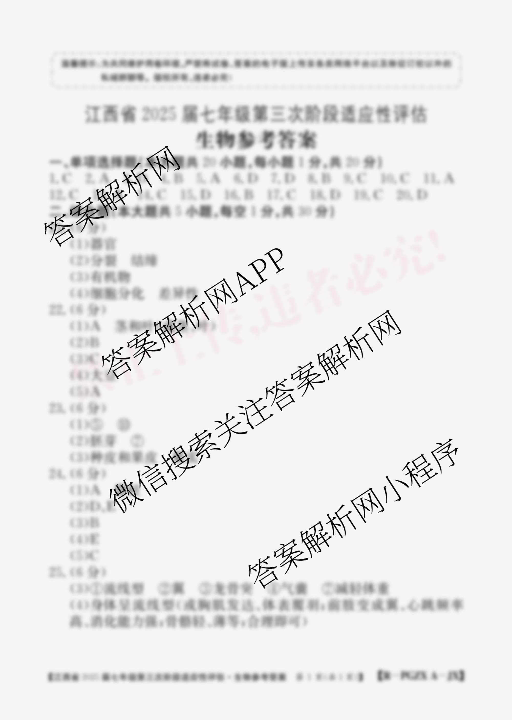 - (七年级)江西省2025届第三次阶段适应性评估[PGZX A-JX]生物(R)答案