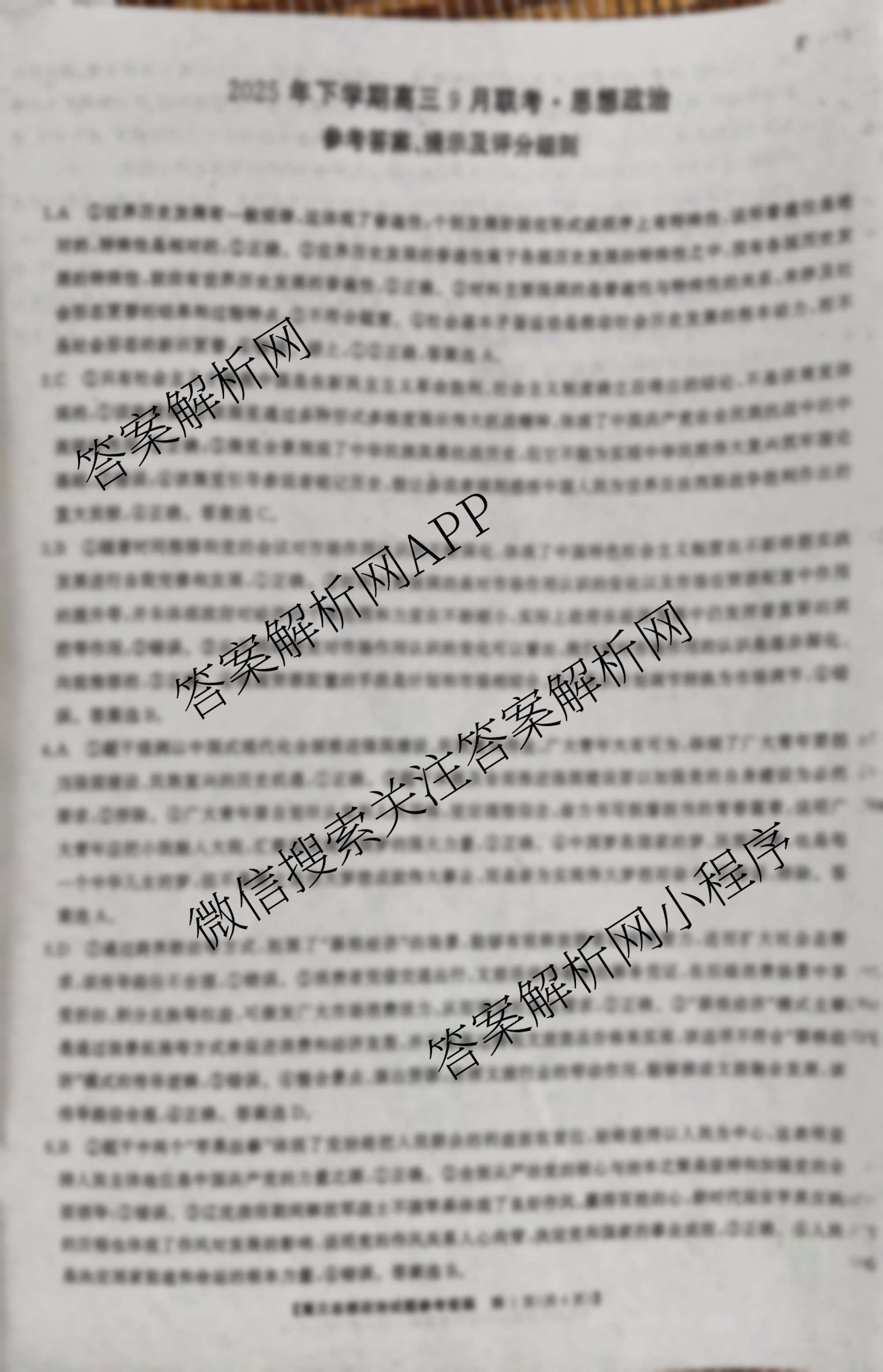 - [高三]湖南[天壹名校联盟]2025年下学期9月联考政治答案