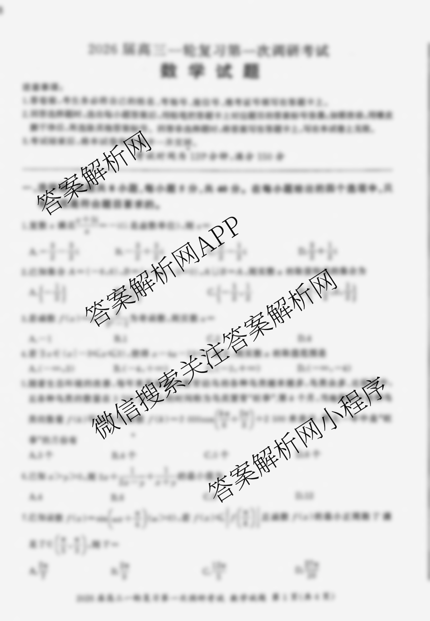 - [高三](百师联盟)·2026届一轮复习第一次调研考试(一)1数学(百A)答案